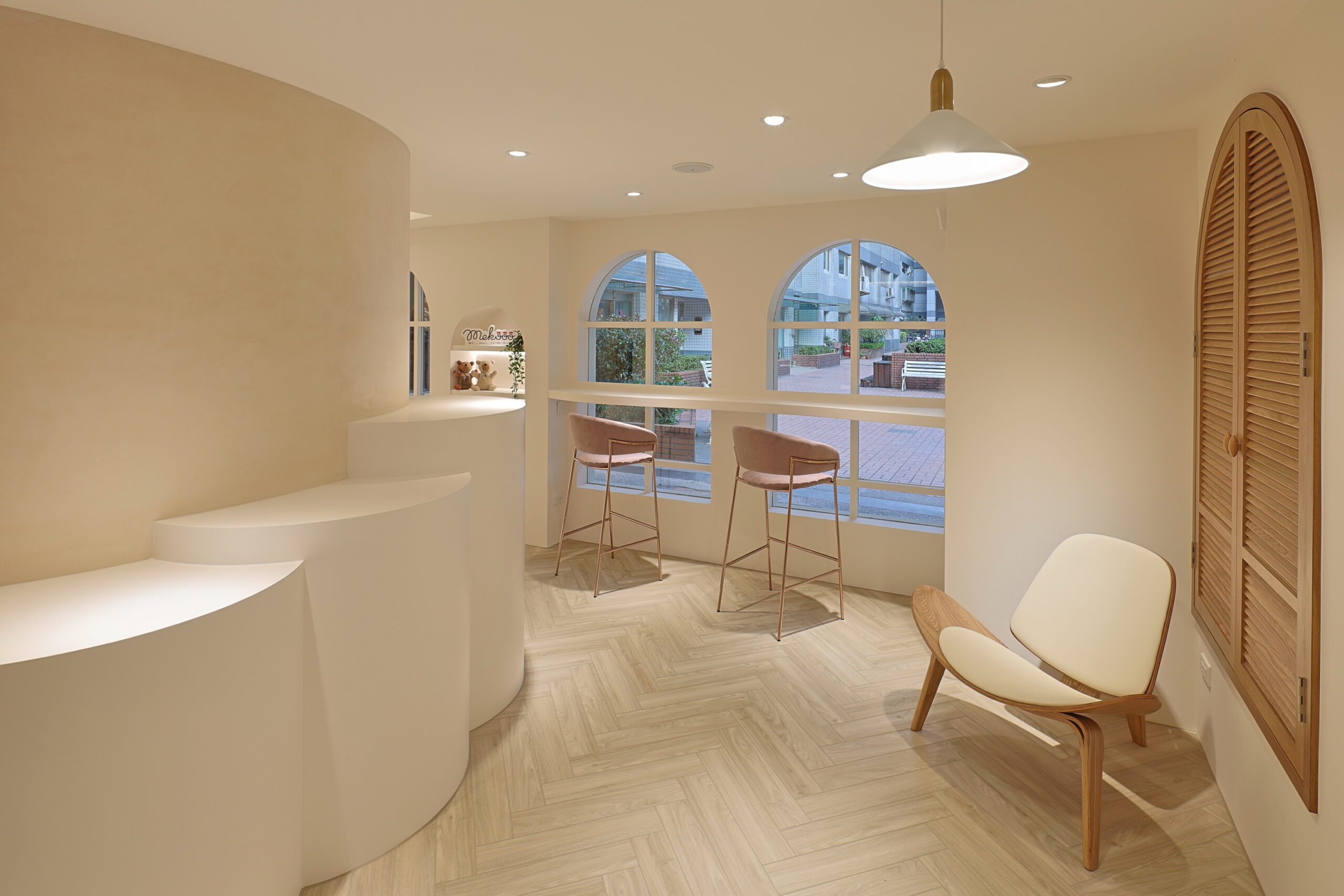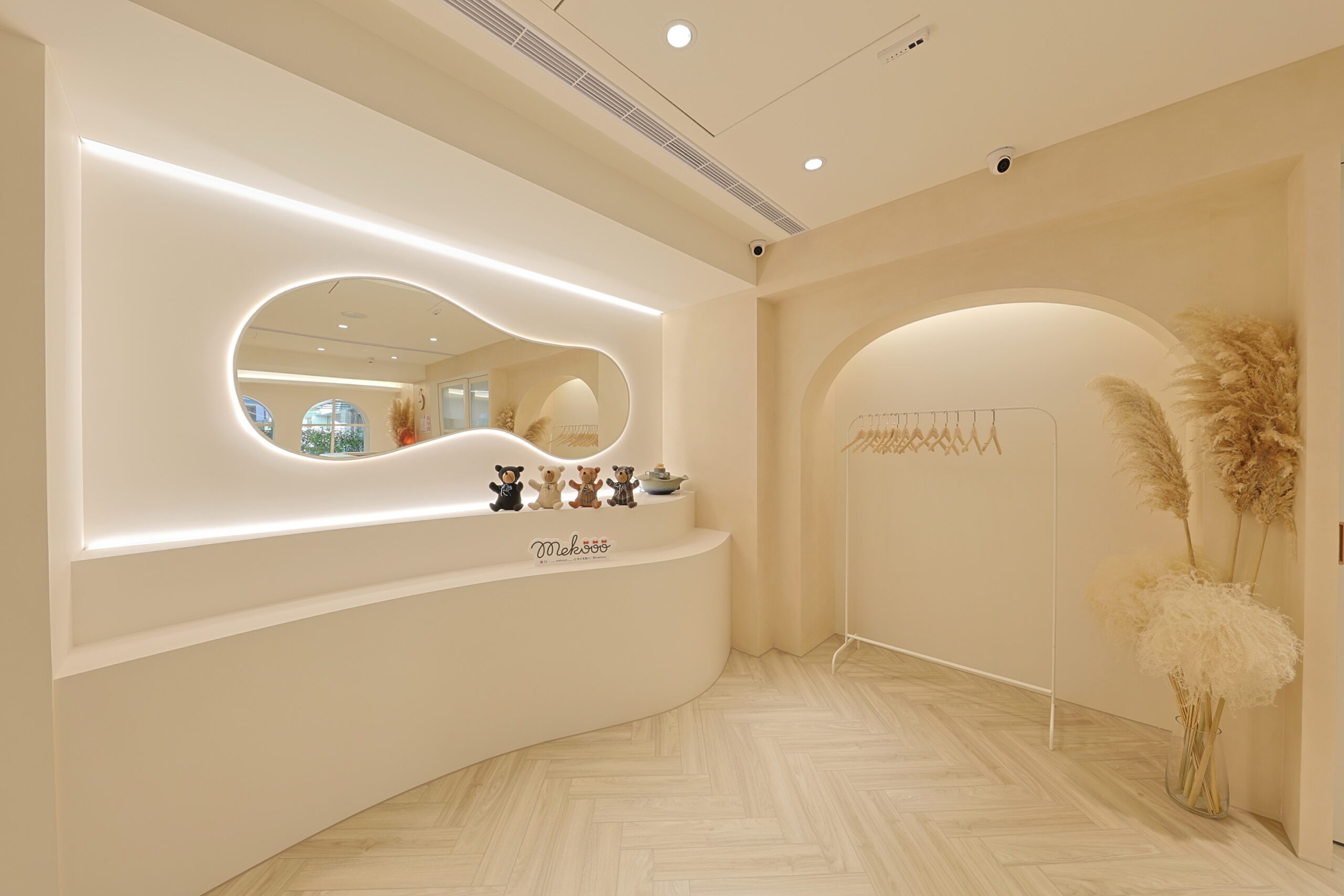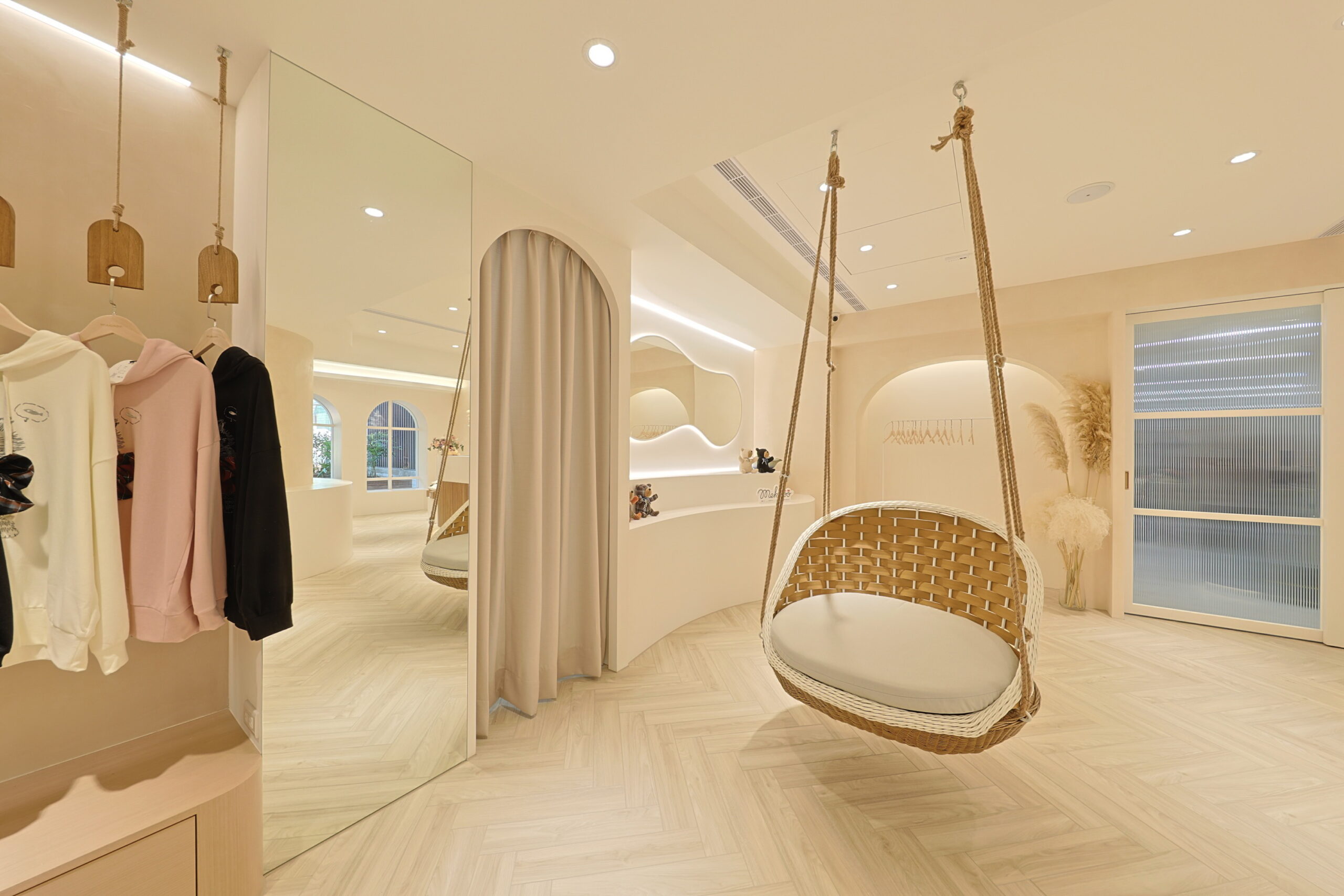 首頁商業空間新莊服飾店新莊服飾店商業空間 / 台北室內設計, 台北空間設計, 商業空間設計, 室內裝修工程, 室內裝修規劃, 店面設計, 空間規劃奶茶色系的網拍服飾旗艦店 柔柔的奶茶色搭配弧形木作櫃及造型弧度天花的線條 不規則明鏡照映出沙發盪鞦韆的可愛迴盪在整體空間中 打造出附有童趣的服飾店 拱型窗的吧檯空間營造出放鬆的休閒時刻