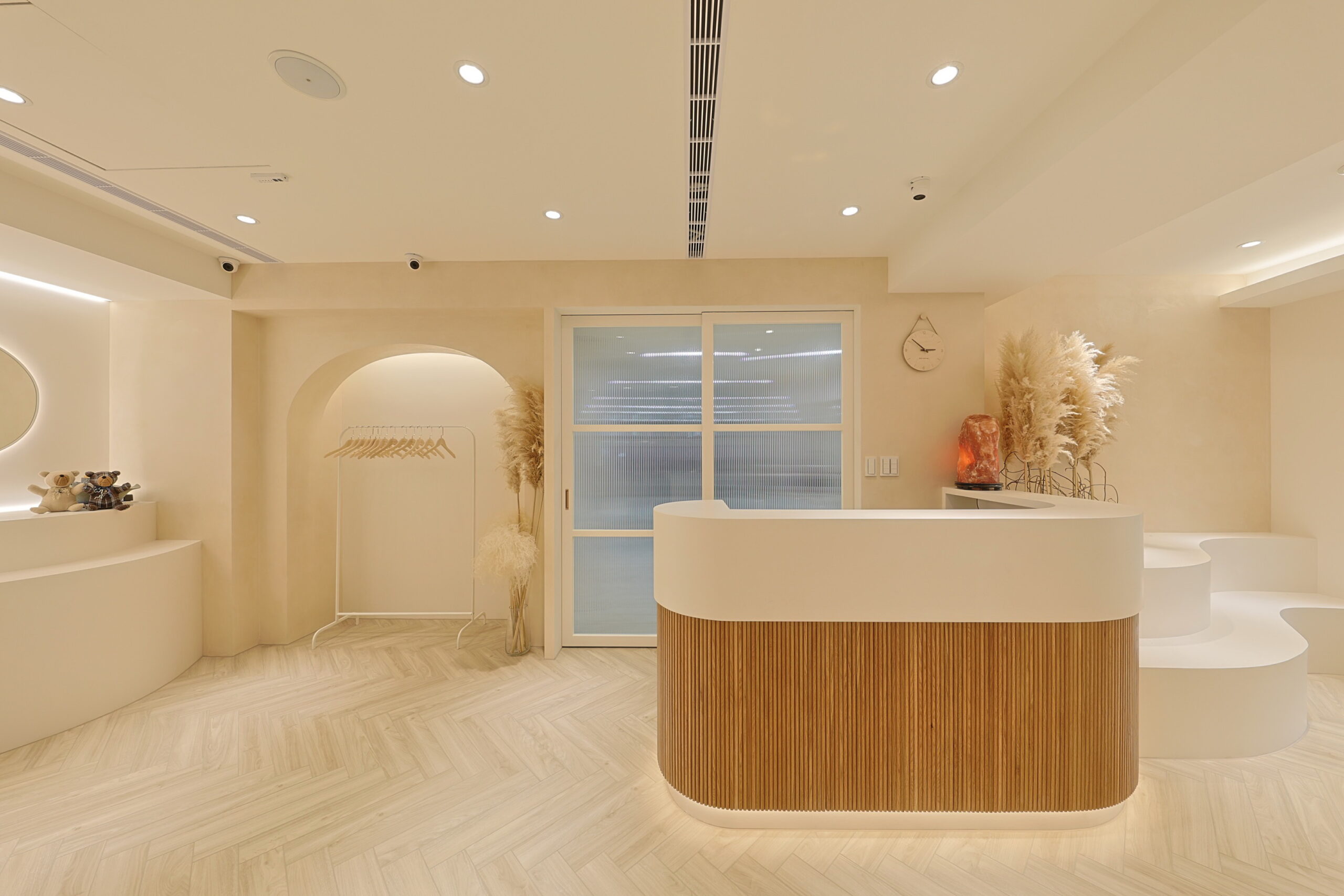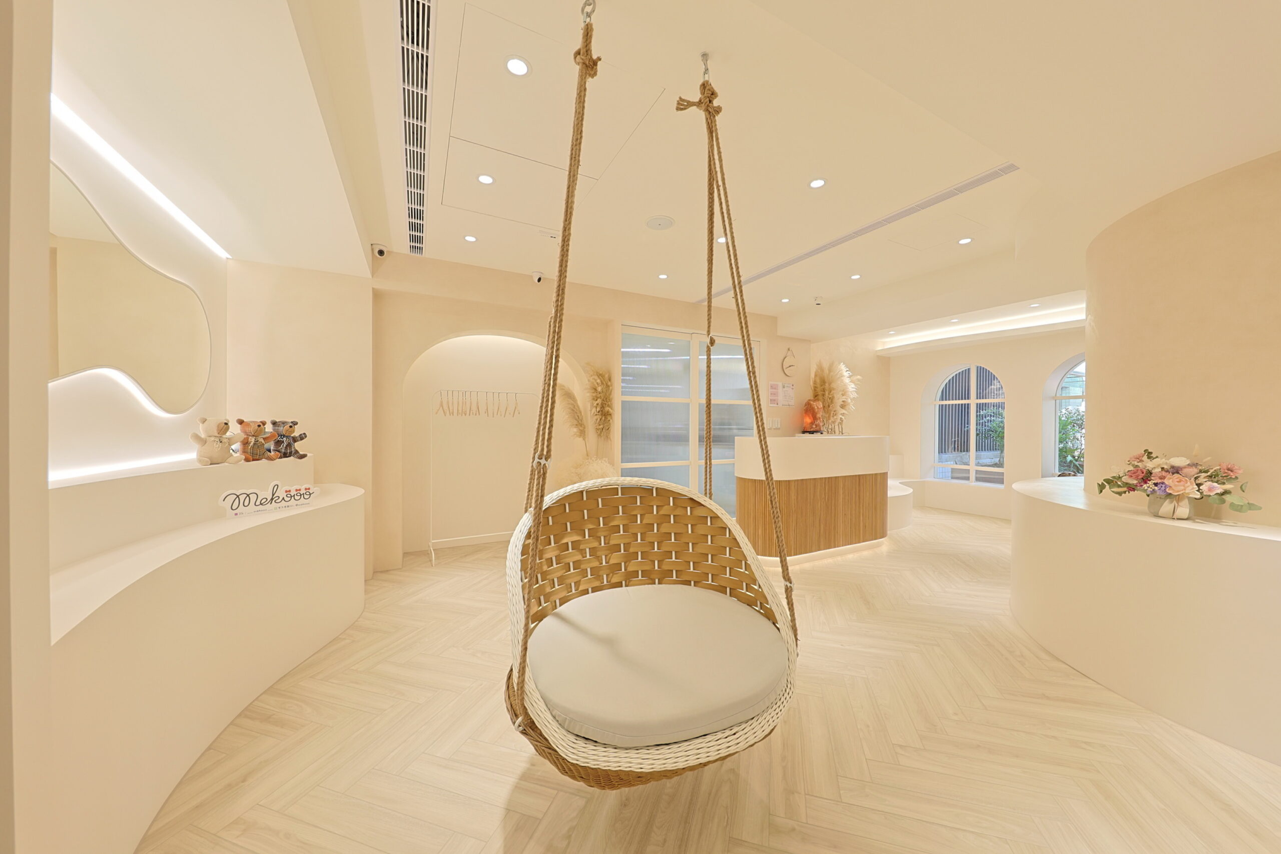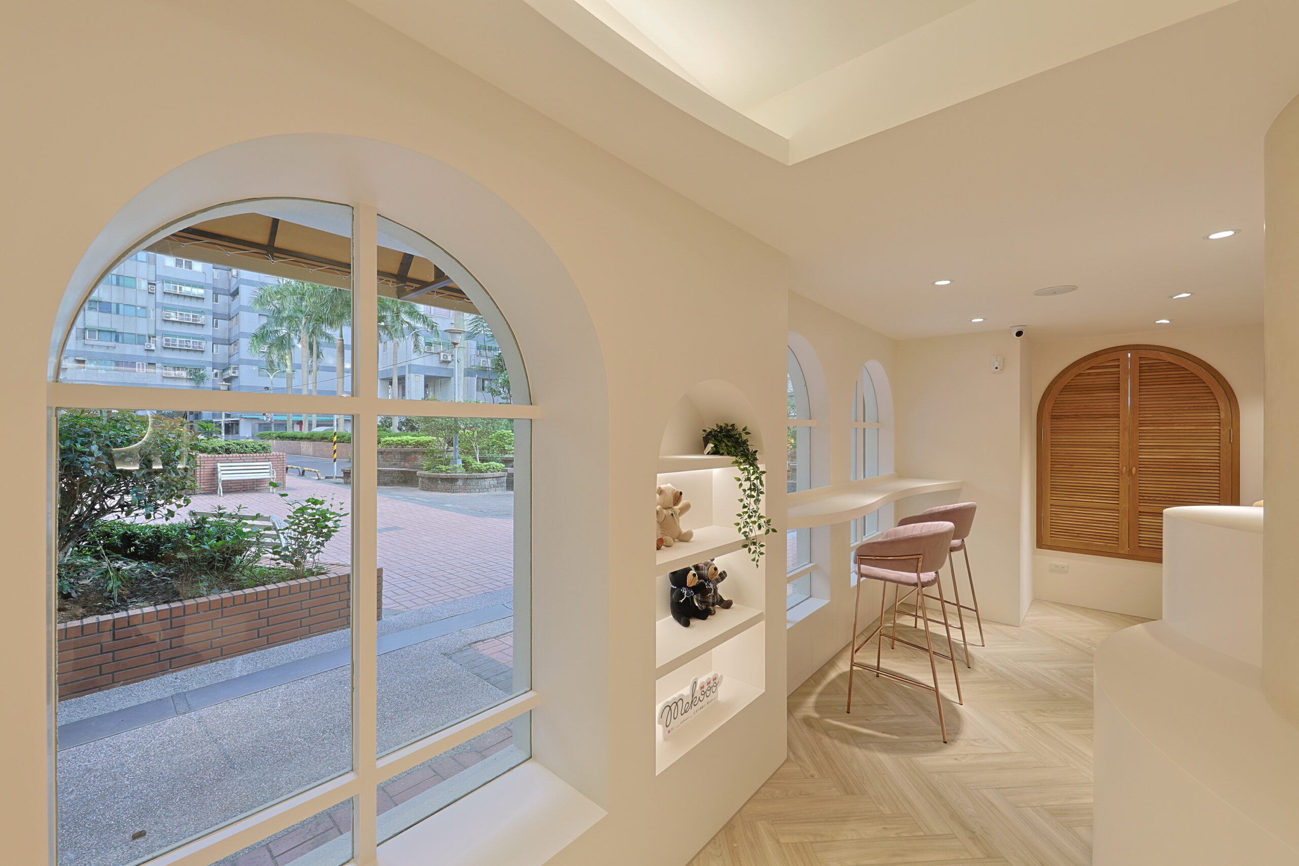 首頁商業空間新莊服飾店新莊服飾店商業空間 / 台北室內設計, 台北空間設計, 商業空間設計, 室內裝修工程, 室內裝修規劃, 店面設計, 空間規劃奶茶色系的網拍服飾旗艦店 柔柔的奶茶色搭配弧形木作櫃及造型弧度天花的線條 不規則明鏡照映出沙發盪鞦韆的可愛迴盪在整體空間中 打造出附有童趣的服飾店 拱型窗的吧檯空間營造出放鬆的休閒時刻
