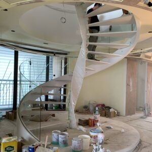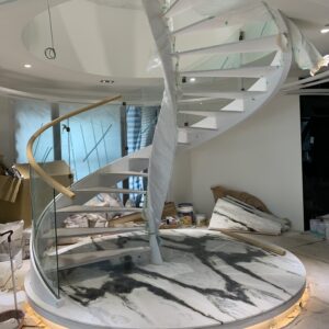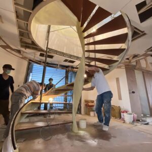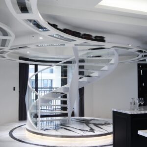 這個空間,擁有一個令人驚艷的特點 – 一個樓梯,它不僅是功能性的,還是一個獨特的藝術品。這條樓梯以鐵製結構為基礎,經過巧妙的設計和精心的製作,呈現出優雅而現代的外觀。樓梯的踏面採用了優質的大理石材料,質感細膩,為空間增添了一抹奢華的氛圍。而樓梯的扶手則採用了圓弧玻璃,它不僅為樓梯提供了必要的支撐,同時也營造了通透明亮的感覺,讓整個空間更加開闊和光線充足。這條旋轉樓梯的設計是一種融合了現代與傳統元素的完美結合。它的簡潔線條和精心計算的比例使其成為整個空間的焦點。無論您是從上還是從下看,這條樓梯都會給人留下深刻的印象。這個住宅空間的裝潢風格正是以現代風為主。從整體設計到細節處理,都注重簡潔、明亮和舒適的感覺。通過巧妙的空間規劃,每個角落都被充分利用,使整個空間充滿生機和活力。現代風的住宅空間設計以簡約為主,注重功能性和實用性。它融入了最新的設計趨勢和科技元素,使居住環境更加便利和智能化。 在這個空間裡,樓梯不僅是一個功能性的元素,更是一個藝術品和焦點。它以其獨特的鐵製結構、華麗的大理石踏面和優雅的圓弧玻璃扶手,展現出現代風格的精髓和設計師的巧思。